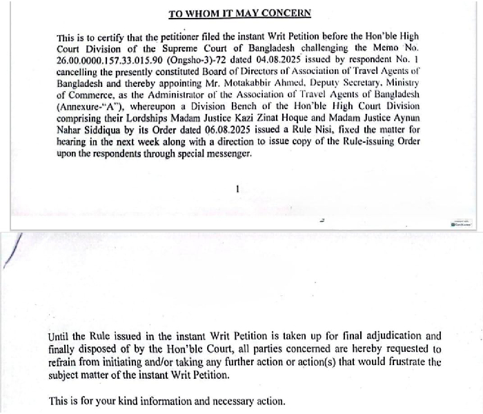 অ্যাসোসিয়েশন অব ট্রাভেল এজেন্টস অব বাংলাদেশের (আটাব) পরিচালনা পর্ষদ বাতিল করে বাণিজ্য মন্ত্রণালয়ের উপসচিব মোতাকাব্বির আহমেদকে প্রশাসক নিয়োগের আদেশ কেন অবৈধ ঘোষণা করা হবে না, তা জানতে চেয়ে রুল জারি করেছেন হাইকোর্ট।