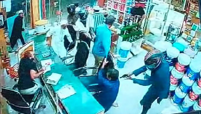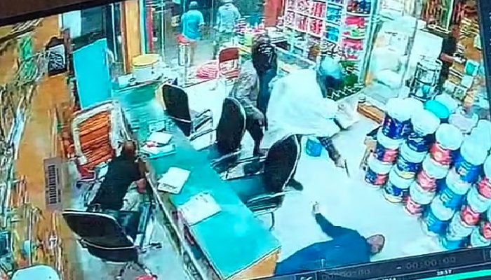 মিরপুর ১২ নম্বর সেকশনের সি ব্লকে হার্ডওয়্যারের দোকানে পল্লবী থানা যুবদল নেতা গোলাম কিবরিয়াকে (৪৭) গুলি করে দুর্বৃত্তরা । ছবি: সংগৃহীত/সিসিটিভি ফুটেজ
