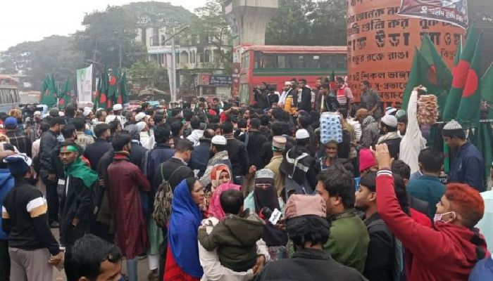 ইনকিলাব মঞ্চের আহ্বায়ক শরীফ ওসমান হাদি হত্যাকাণ্ডের বিচার ও জড়িতদের দ্রুত গ্রেফতারের দাবিতে টানা তৃতীয় দিনের মতো শাহবাগ মোড় অবরোধ করেছেন সংগঠনের নেতাকর্মীরা। রবিবার (২৮ ডিসেম্বর) দুপুর আড়াইটা থেকে শাহবাগের সবকটি গুরুত্বপূর্ণ সড়ক বন্ধ করে অবস্থান নেওয়ায় রাজধানীর বড় একটি অংশে তীব্র যানজট সৃষ্টি হয়েছে। একই দাবিতে আজ দুপুর ২টা থেকে দেশের ৮টি বিভাগেও একযোগে অবরোধ কর্মসূচি পালন করছে সংগঠনটি।
