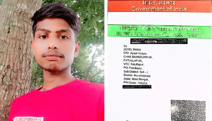 নিহত জুয়েল রানা (বামে) এবং তার আধার কার্ড (ডানে), যা তার ভারতীয় নাগরিকত্বের প্রমাণ দিলেও প্রাণ বাঁচাতে পারেনি। ছবি: সংগৃহীত
