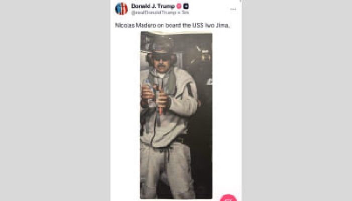ট্রুথ সোশ্যালে প্রকাশিত ছবিতে দেখা যায়, ভেনেজুয়েলার প্রভাবশালী এই নেতা অত্যন্ত বিধ্বস্ত অবস্থায় দাঁড়িয়ে আছেন। তার চোখ বাঁধা এবং হাতে হাতকড়া লাগানো। এক হাতে একটি পানির বোতল ধরা অবস্থায় তাকে মার্কিন সেনাদের পাহারায় দেখা যায়। ছবির ক্যাপশনে ট্রাম্প লিখেছেন, "নিকোলাস মাদুরোকে মার্কিন রণতরী 'ইউএসএস আইও জিমা'-তে তোলা হচ্ছে।"