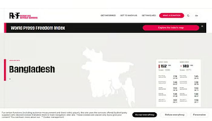 আরএসএফ-এর ২০২৬ সালের সূচকে ১৮০টি দেশের মধ্যে ১৫২তম অবস্থানে নেমে এসেছে বাংলাদেশ, যা স্বাধীন সাংবাদিকতার জন্য এক অশনিসংকেত।