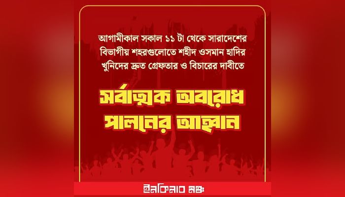 শহীদ ওসমান হাদির খুনিদের গ্রেপ্তার ও দ্রুত বিচারের দাবিতে আগামীকাল রোববার বেলা ১১টা থেকে দেশের সব বিভাগীয় শহরে সর্বাত্মক অবরোধ পালনের ডাক দিয়েছে ইনকিলাব মঞ্চ। শনিবার রাতে রাজধানীর শাহবাগে অবস্থান কর্মসূচি থেকে এবং পরবর্তীতে সংগঠনের ফেসবুক পেজে এই কঠোর কর্মসূচির ঘোষণা দেওয়া হয়। পরিবেশ উপদেষ্টা ও ডিএমপি কমিশনারের দ্রুত বিচারের আশ্বাসের মধ্যেও আন্দোলনে অনড় থাকার বার্তা দিয়েছেন সংগঠনটির নেতা-কর্মীরা।