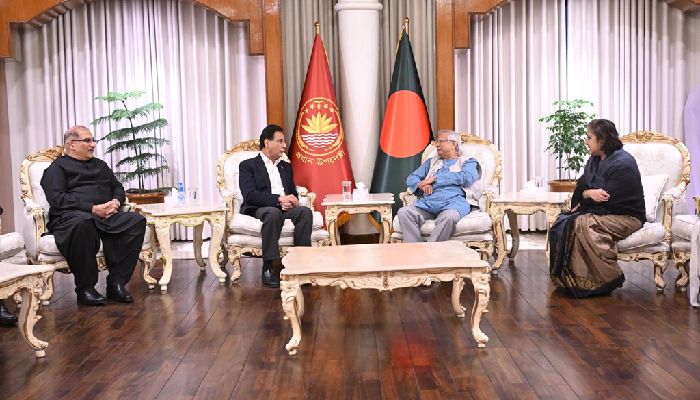 রাষ্ট্রীয় অতিথি ভবন যমুনায় প্রধান উপদেষ্টা মুহাম্মদ ইউনূসের সঙ্গে পাকিস্তানের জাতীয় পরিষদের স্পিকার সরদার আয়াজ সাদিকের সৌজন্য সাক্ষাৎ। ছবি: পিআইডি