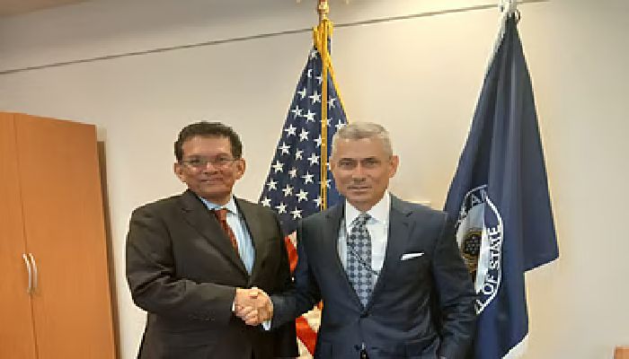 ওয়াশিংটনে মার্কিন পররাষ্ট্র দপ্তরে দ্বিপাক্ষিক বৈঠকে জাতীয় নিরাপত্তা উপদেষ্টা খলিলুর রহমান ও যুক্তরাষ্ট্রের রাজনীতিবিষয়ক আন্ডার সেক্রেটারি অ্যালিসন হুকার।
