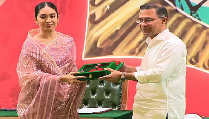 সাবেক প্রধানমন্ত্রী বেগম খালেদা জিয়ার মরণোত্তর ‘স্বাধীনতা পুরস্কার-২০২৬’ গ্রহণ করছেন তাঁর নাতনি ব্যারিস্টার জাইমা রহমান। পদক তুলে দিচ্ছেন প্রধানমন্ত্রী তারেক রহমান। বৃহস্পতিবার, ওসমানী স্মৃতি মিলনায়তন। ছবি: বাসস