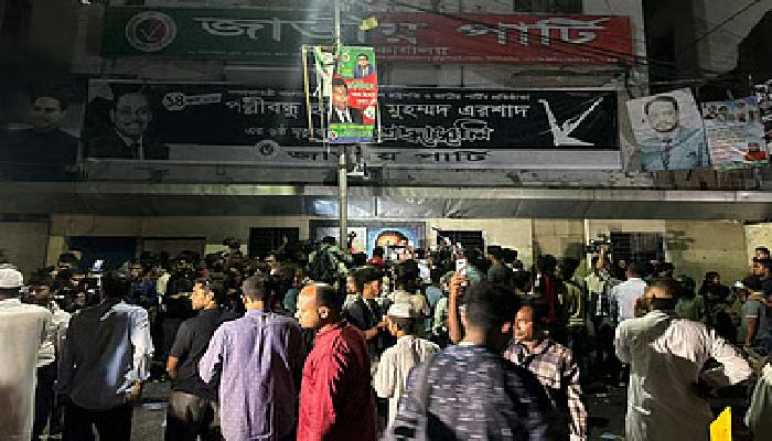 রাজধানীর কাকরাইলে জাতীয় পার্টির (জাপা) কেন্দ্রীয় কার্যালয়ে হামলা চালিয়েছে একদল বিক্ষোভকারী। শনিবার সন্ধ্যায় সংঘটিত এ হামলায় কার্যালয়ের নিচতলায় আগুন দেওয়া হয় এবং ভাঙচুর করা হয়। পরিস্থিতি নিয়ন্ত্রণে আনতে পুলিশ জলকামান ব্যবহার ও লাঠিপেটা করলে বিক্ষোভকারীরা ছত্রভঙ্গ হয়ে যায়। এই ঘটনায় দুই সাংবাদিক আহত হয়েছেন।