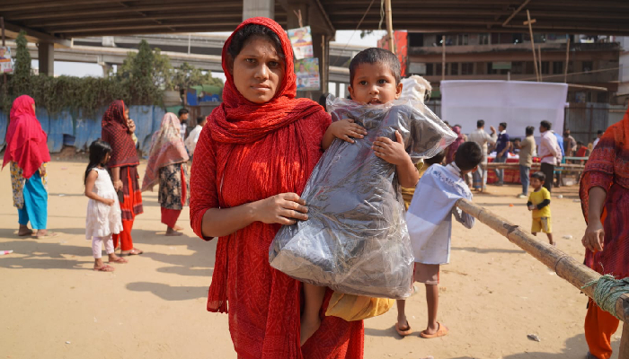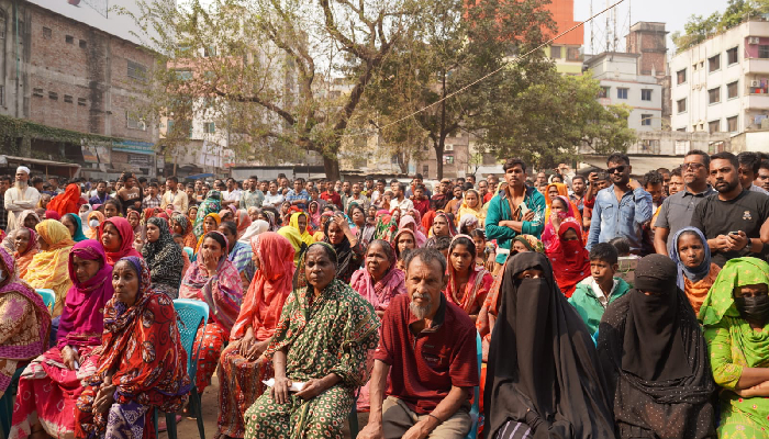 রবিবার সকালে ডিএনসিসির ২৬ নম্বর ওয়ার্ডের তেজকুনি পাড়া খেলাঘর মাঠে বেগম খালেদা জিয়ার সুস্থতা কামনায় গরিবদের মাঝে কম্বল বিতরণ অনুষ্ঠানে সাদা পাঞ্জাবি ও টুপি পরিহিত বিএনপি নেতা সাইফুল আলম নিরব (মাঝে)।